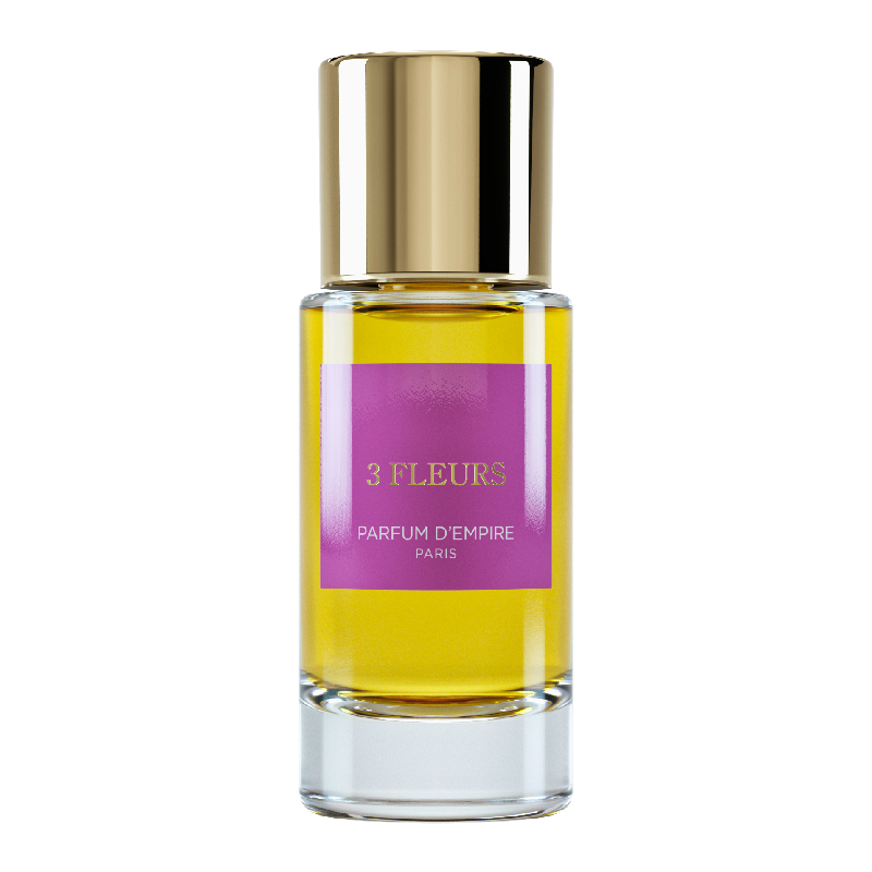 3 Fleurs di Parfum D'Empire è un profumo sensuale, fresco, esplosivo e inebriante al tempo stesso. 3 Fleurs per 3 amori, questa fragranza contiene 3 fiori simbolo dell'amore nelle grandi civiltà. La rosa, con le sue note pure, simboleggia l'amore passionale. Di contro, il calore del gelsomino evoca l'amore romantico. Infine l'allusiva tuberosa simboleggia l'amore proibito. In 3 Fleurs sono presenti la rosa bulgara, il gelsomino egiziano e la tuberosa indiana, in una miscela che unisce i migliori ingredienti utilizzati per la produzione di profumi. Questa fragranza si rivela un fiore impertinente che conduce all'amore, grazie alla sua personalità davvero unica ed originale.
